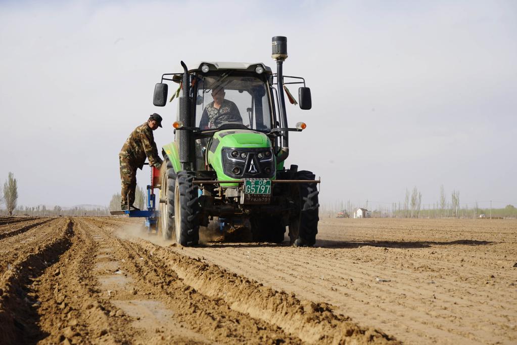 4月12日,農(nóng)機(jī)合作社的工作人員正在耕種烏拉特前旗蘇獨侖鎮(zhèn)的托管土地。 新華社記者侯維軼 攝