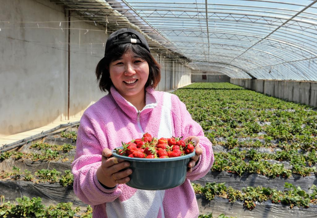 來自河南的農民楊華麗在西藏阿里地區噶爾縣生態農業產業園展示自己種出的草莓(2022年4月10日攝)。新華社記者 姜帆 攝