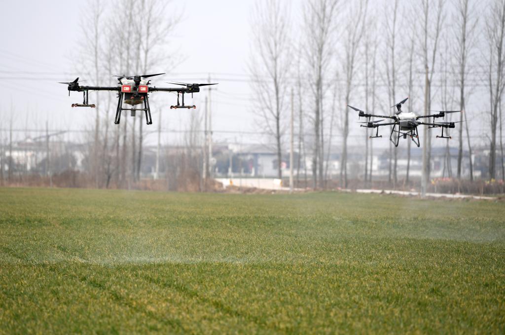 2月11日,無人機在安徽省亳州市譙城區趙橋鄉“無人農場”噴灑除草劑。新華社記者 劉軍喜 攝