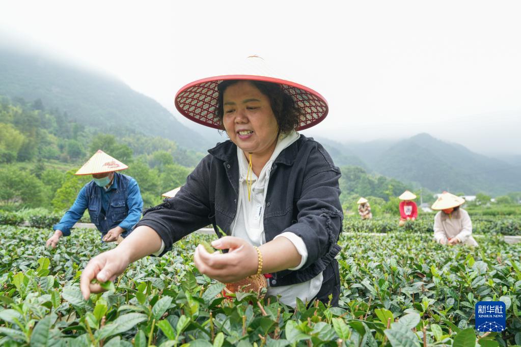 5月11日,村民在安徽省金寨縣花石鄉大灣村生態茶園內采摘茶葉。新華社記者 杜宇 攝