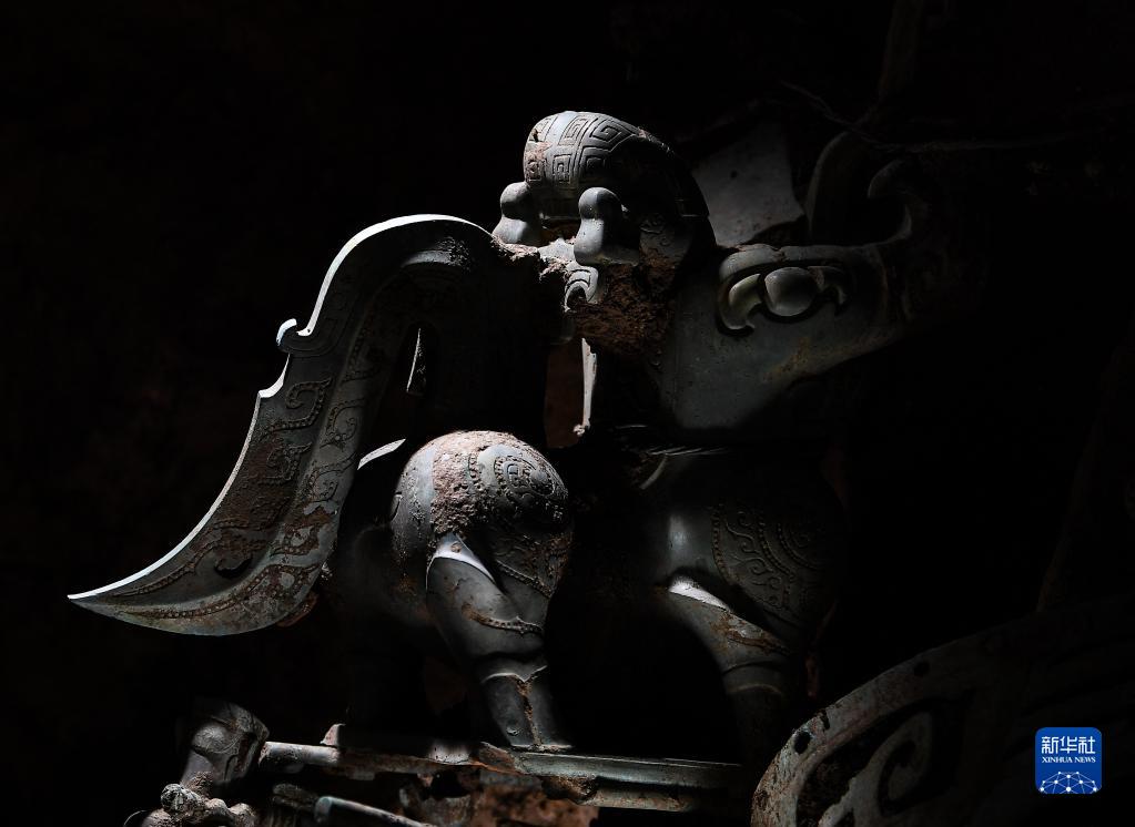 這是在三星堆遺址8號“祭祀坑”拍攝的銅神獸(6月1日攝)。新華社記者 王曦 攝