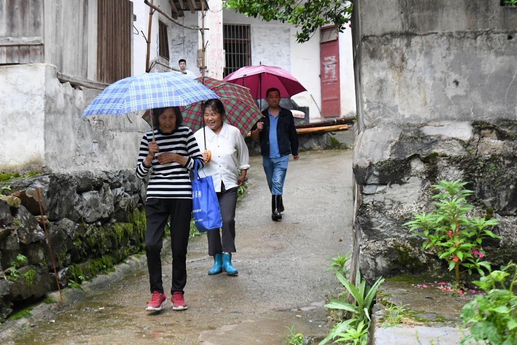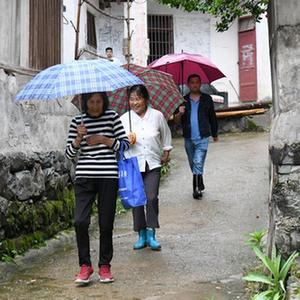 19日下午,天空淅淅瀝瀝下著小雨,在安徽省黃山市徽州區呈坎鎮容溪村,村民胡愛萍和鄰居一起冒雨走出家門,坐上鎮政府安排的汽車,前往楊干集中安置區。