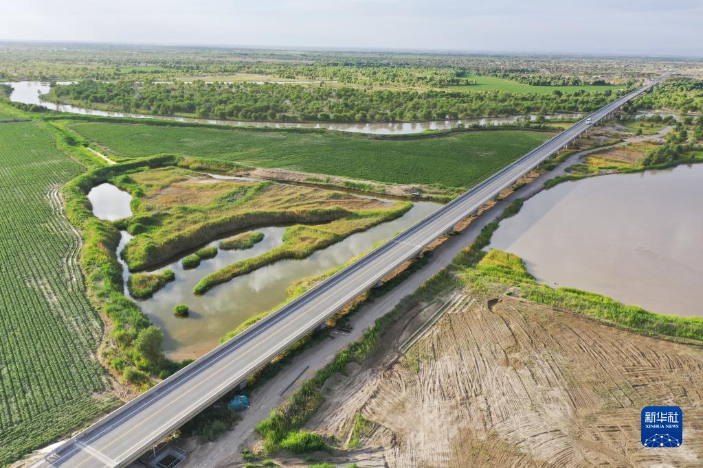 尉犁至且末沙漠公路穿越塔里木河和胡楊林(6月22日攝,無人機照片)。新華社記者 李響 攝