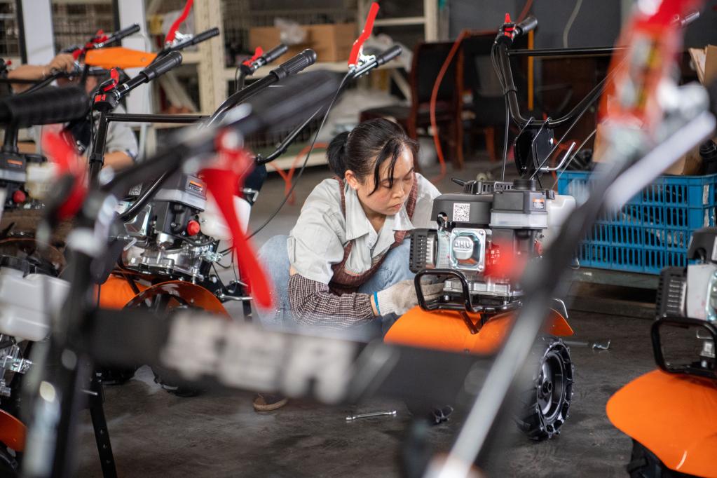 5月30日,在華世丹機械車間內,工人在調試小型農用機械。新華社記者 唐奕 攝