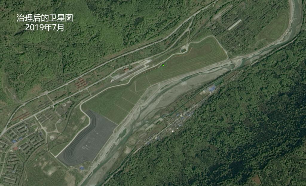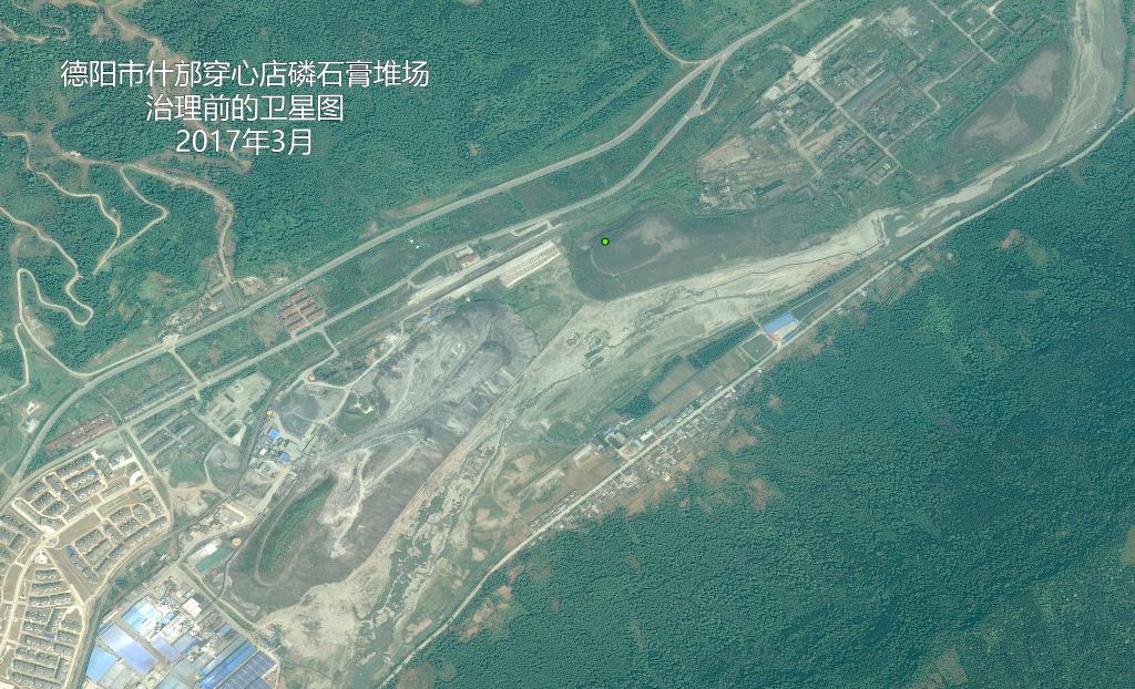 德陽什邡市穿心店磷石膏堆場位于沱江上游支流石亭江岸。由于各方面原因,磷石膏堆場時常出現滲漏、滑坡等情況,導致周邊水質、土壤及石亭江總磷超標,影響沱江下游水質。上圖為位于磷石膏堆場治理前的衛星圖和實拍圖。下圖為同一點位,磷石膏堆場治理后的衛星圖和實拍圖。