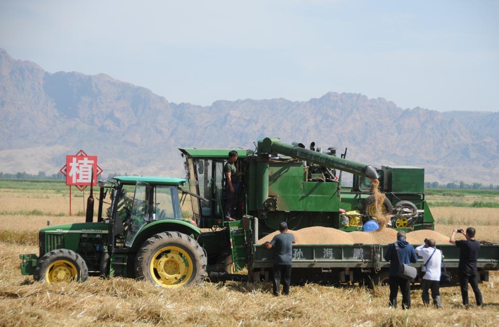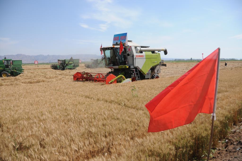 臨河區(qū)新華鎮(zhèn)十萬(wàn)畝高產(chǎn)高效糧食生產(chǎn)示范園區(qū)開(kāi)展麥?zhǔn)展ぷ鳌P氯A社記者 李云平攝