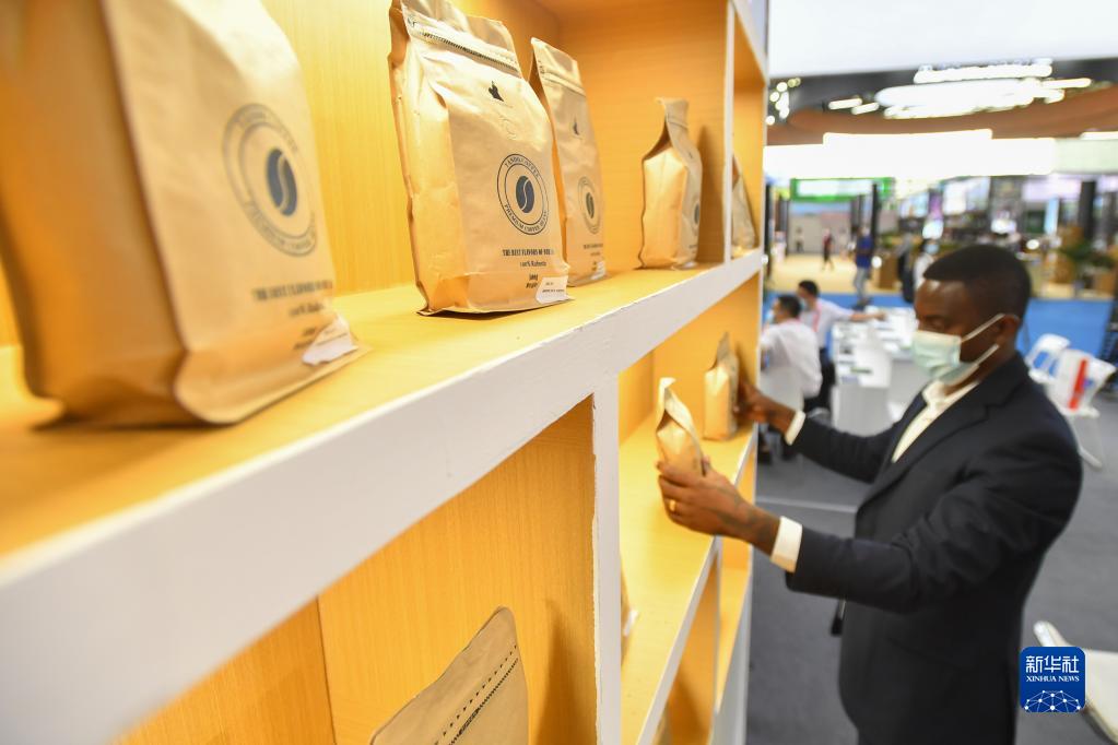 在湖南長沙舉行的第二屆中國-非洲經貿博覽會上,參展商在整理非洲咖啡(2021年9月27日攝)。新華社記者 陳澤國 攝