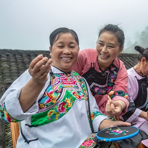 在湖南省湘西土家族苗族自治州花垣縣十八洞村,村民在討論苗繡制作(2020年7月16日攝)。新華社發(石林榮攝)