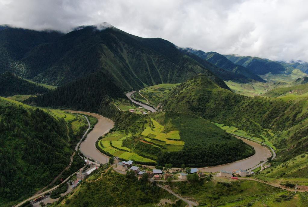 這是2021年8月7日在青海省果洛藏族自治州班瑪縣境內拍攝的瑪可河(無人機照片)。新華社記者 張龍 攝