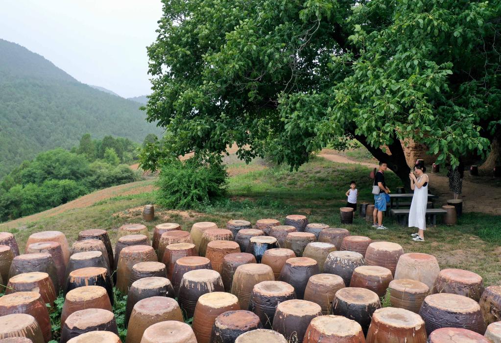 山間芳樹遍植,花谷梯田蔓延,傳統民房、窯洞、紅燈籠點綴其間,以陶缸、三彩為基礎的創意作品隨處可見,這個位于伏牛山深處的小村,儼然一副鄉村藝術公園的模樣。
