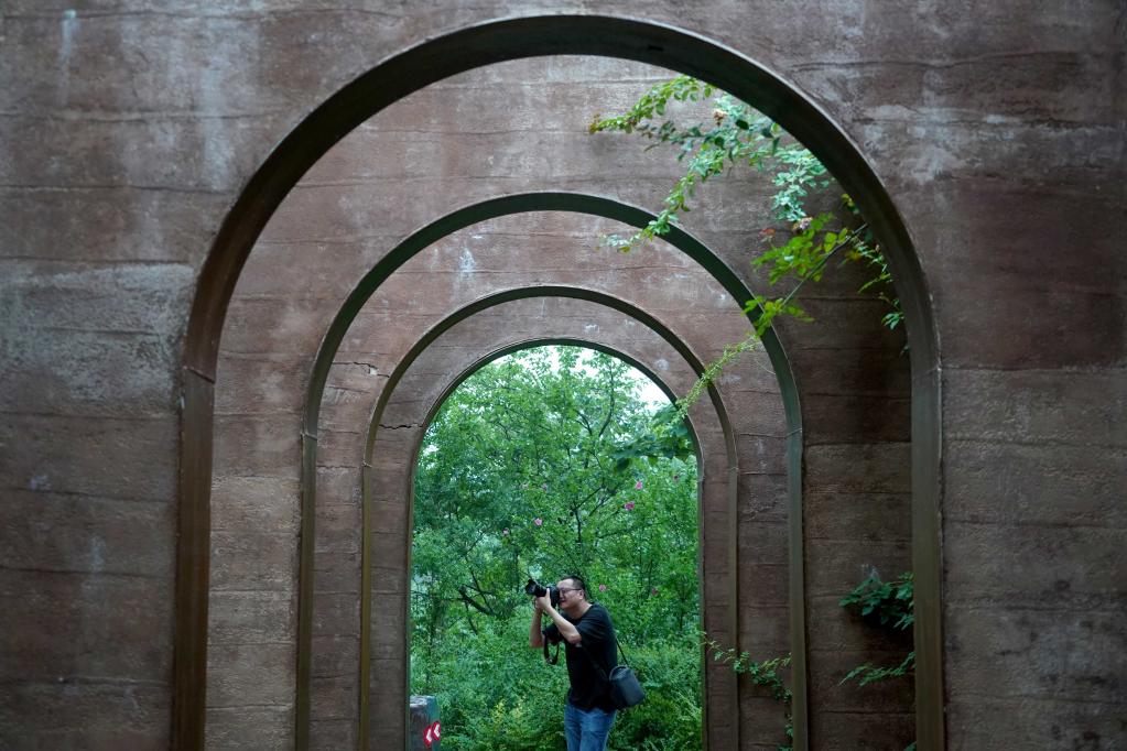 7月13日,游客在“洛陽三彩陶藝村”游覽拍照。新華社記者 李安 攝