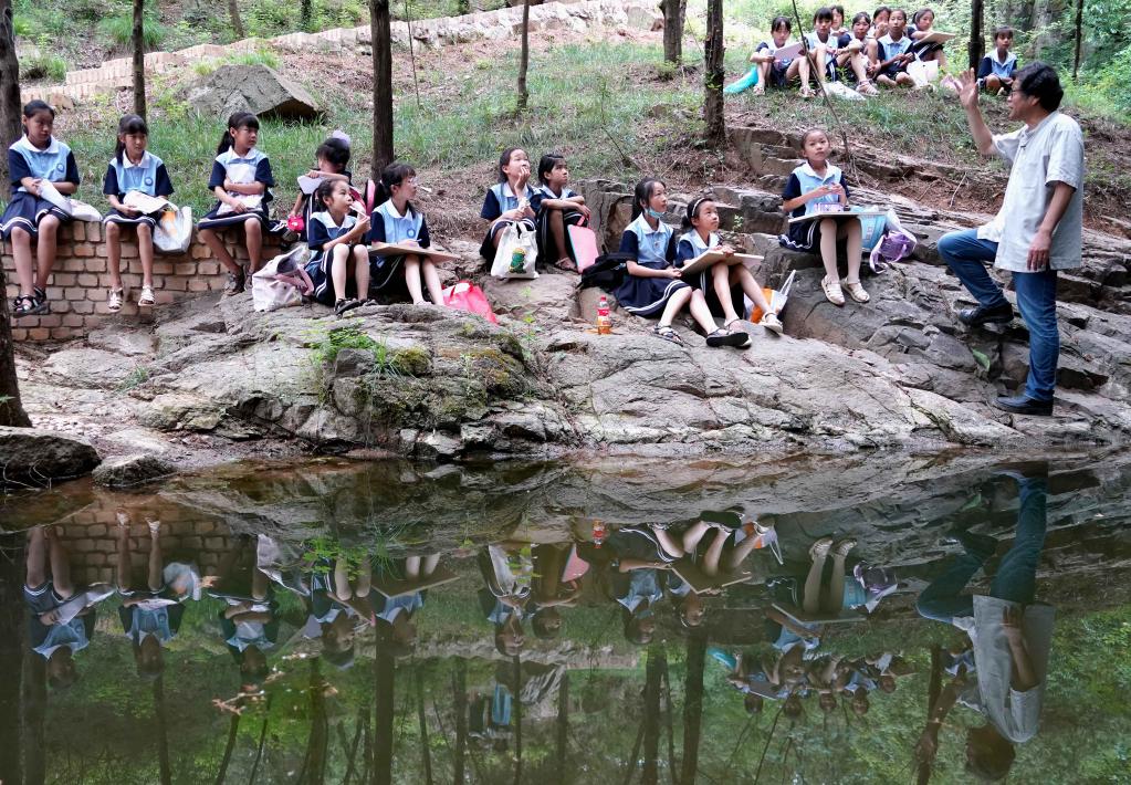 7月12日,郭愛和帶領羅嶺鄉中心小學的學生寫生。新華社記者 李安 攝