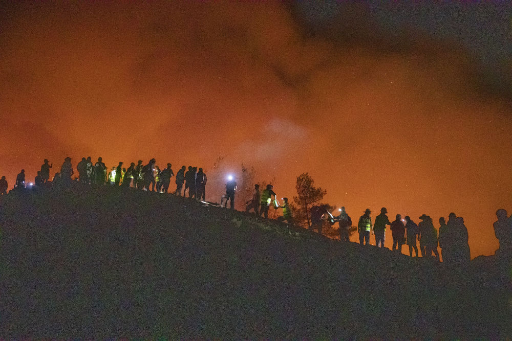 8月25日晚,在山頂隔離帶,救援人員和志愿者嚴陣以待。新華社記者 王全超 攝