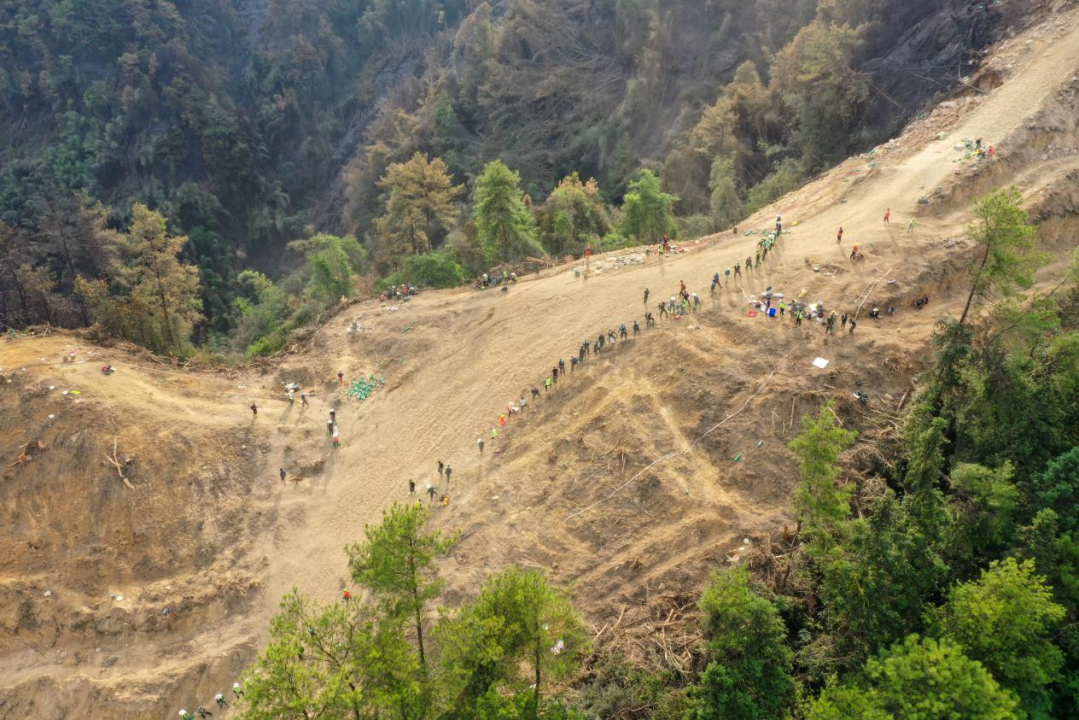 車行至縉云山腳,由于道路狹窄,汽車已不能通行,只能步行或是搭乘摩托車前往。因為是新開挖的道路,加上天氣干燥,運送物資的摩托車來回奔跑,將近2公里的道路幾乎全時段都是處于漫天塵土飛揚的狀態。摩托轟鳴,救援人員腳步匆忙,抬頭望去,山上是密密麻麻排成一溜的志愿者組成的“人鏈”,一場“大戰”來臨前的緊迫感壓上心頭。