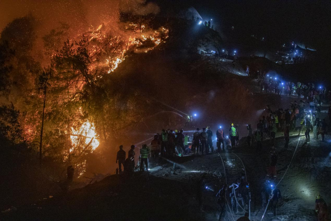 8月25日晚,志愿者在山火隔離帶為救援人員照明。