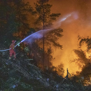8月25日晚,在重慶市北碚區縉云山山火現場,消防人員在一處斜坡地向樹木灑水增加濕度,減弱火頭抵達時的強度。
