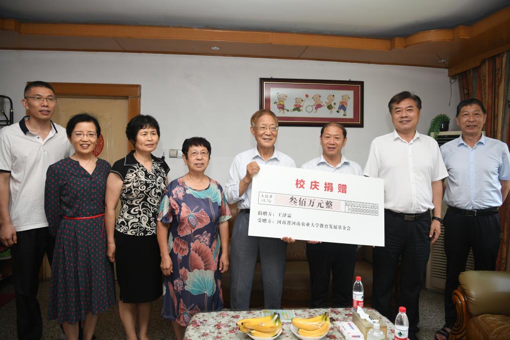 王澤霖(右四)向學校捐贈300萬元。(河南農業大學供圖)