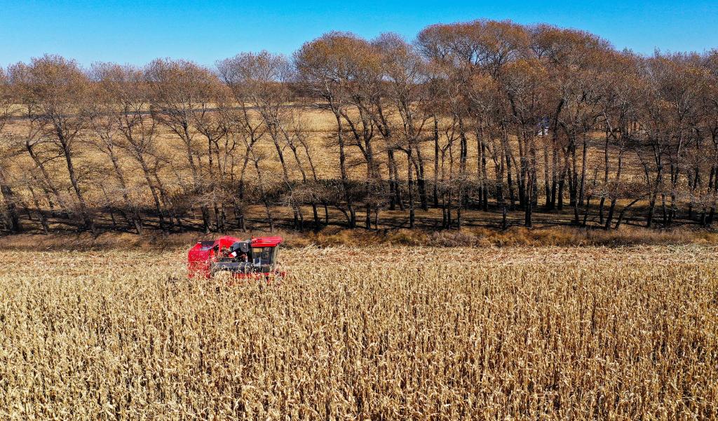 10月18日,這是通遼市奈曼旗新鎮正在收獲的玉米地。(無人機照片 新華社記者 連振 攝)