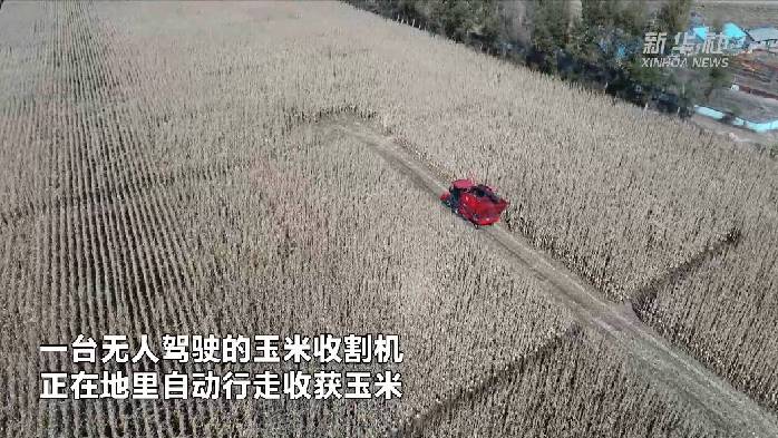 正值東北秋糧收獲期。在位于世界“黃金玉米帶”的吉林省公主嶺市劉房子街道,一臺無人駕駛的玉米收割機正在地里自動行走收獲玉米。