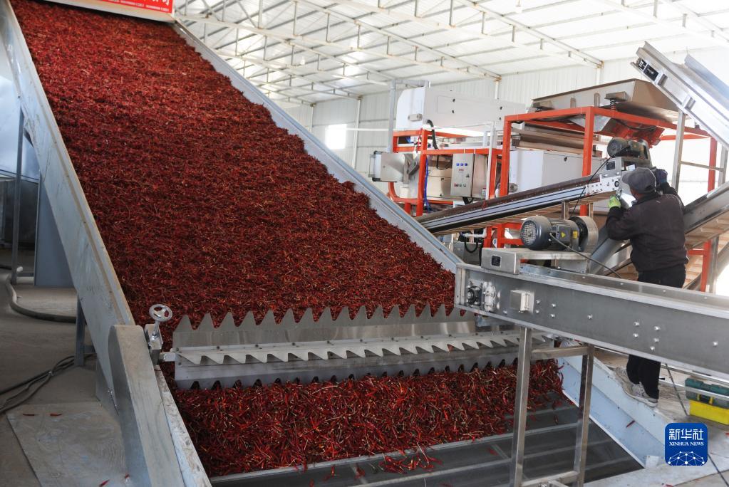記者在白腦包鎮(zhèn)辣椒加工廠看到,院子中存放著一堆堆剛剛收割的辣椒苗,工人將初選好的辣椒投放到廠房中的傳送帶,機器依次完成篩選、色選、烘干等工序,一個個完整、光鮮的干辣椒傳送到包裝車間,最終打包成半成品后進行冷藏。