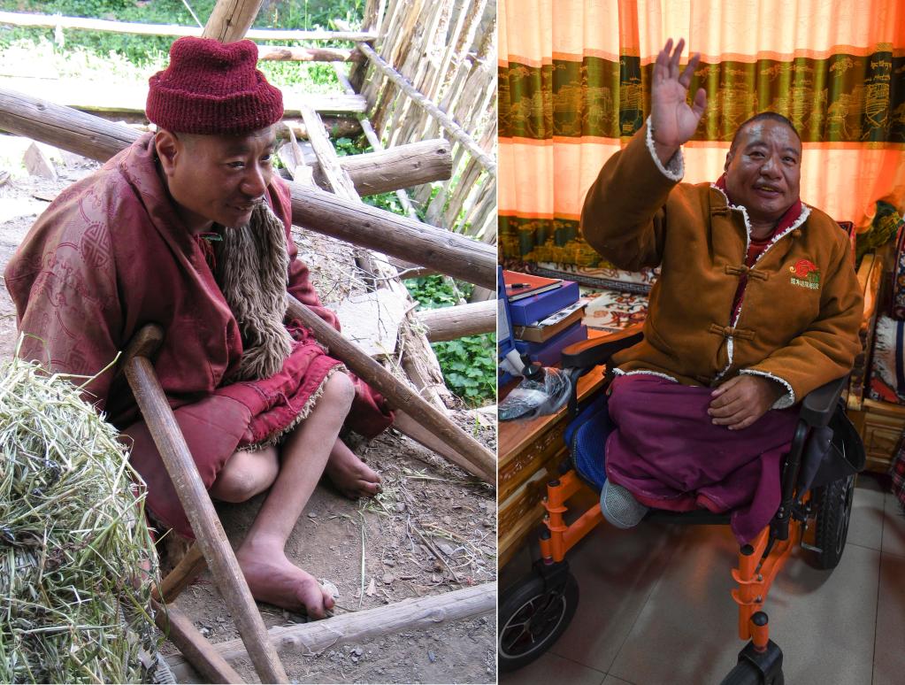 拼版照片:左圖是2004年8月3日在四川省阿壩藏族羌族自治州壤塘縣拍攝的當時身患嚴重大骨節病的土扎。新華社發(田剛攝);右圖是在茸木達鄉敬老院,土扎坐在電動輪椅上(2022年10月16日攝)。新華社記者王曦 攝