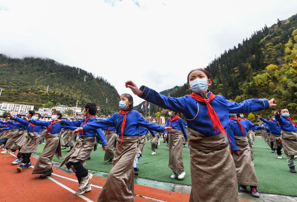 在四川省阿壩藏族羌族自治州壤塘縣寄宿制小學,學生在操場上做課間操(2022年10月15日攝)。新華社記者王曦 攝