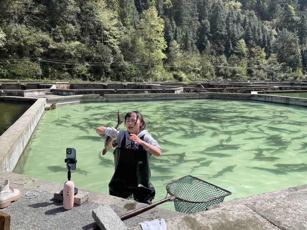 唐勝忠團隊成員在丹江村中通過手機直播帶貨鱘魚。(受訪者供圖)