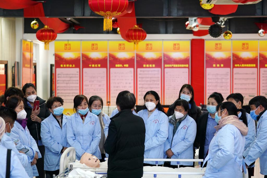 2月4日,在北京市房山區(qū)今日東方培訓基地,今年50歲的護工武翠英(前右二)在培訓課程上演示對于臥床病人的看護照料。新華社記者 鞠煥宗 攝