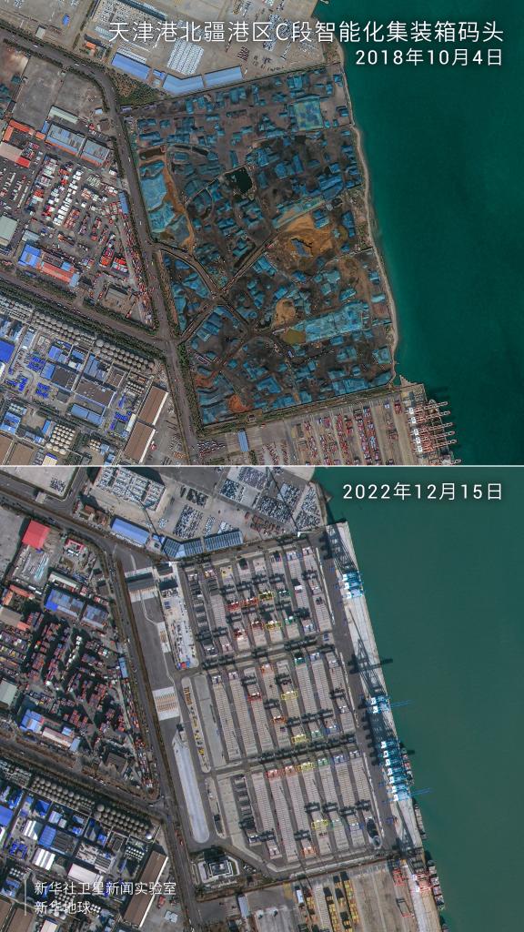 圖為衛星拍攝的天津港北疆港區C段智能化集裝箱碼頭前后對比圖。
