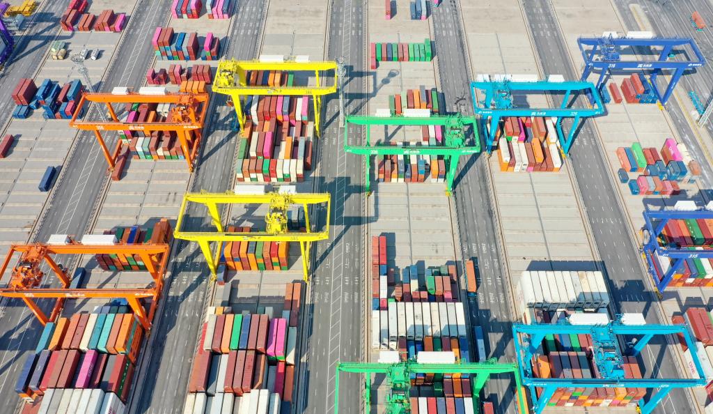 在天津港全物聯網集裝箱碼頭,場橋在堆場內吊運集裝箱(無人機照片,2月21日)。新華社記者 趙子碩 攝