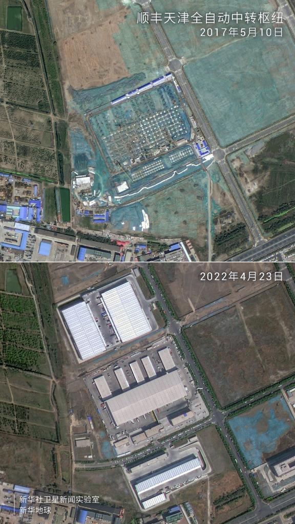 圖為衛星拍攝的順豐天津全自動中轉樞紐前后對比圖。