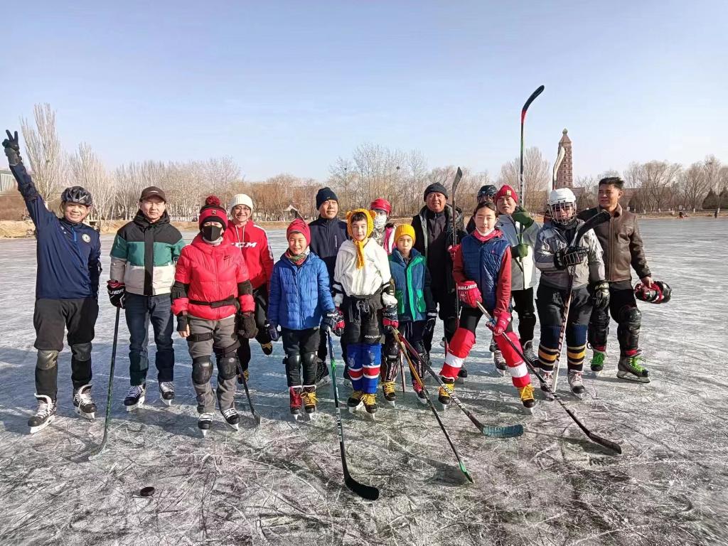 銀川市“火鳳凰”冰球隊在冰面合影。受訪者供圖