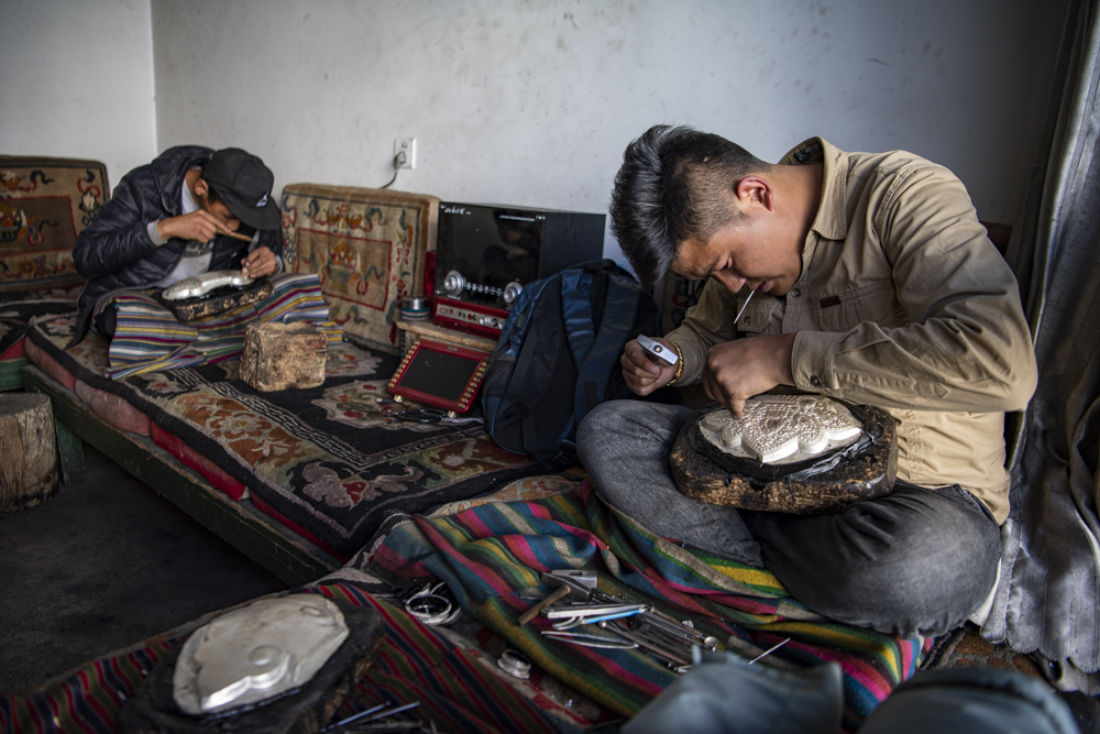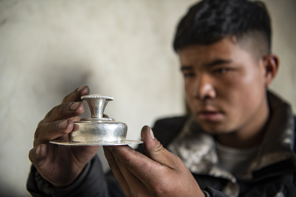 除了銀碗,巴桑扎西還會熟練地制作茶盤茶架、腰扣、禮儀酒壺等日常用品,“入行”6年的他說:“我的技藝水平只是中等,每月收入在4500元到6500元之間。”
