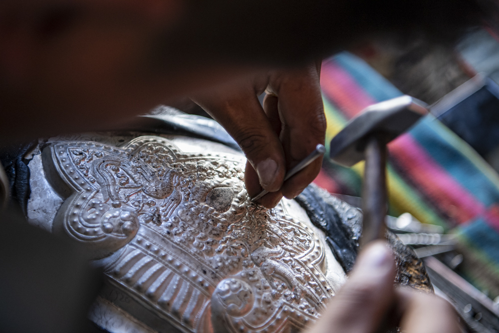 走進加工廠車間,叮叮咚咚的敲擊聲此起彼伏。32歲的巴桑扎西正在制作一個家用小銀碗,他一手捏緊鋼釘,一手拿著小錘不停敲打,“從一塊完整的銀片到打出一個有精致圖案的碗坯,需要‘捶打’兩到三天才能完成。”他說。