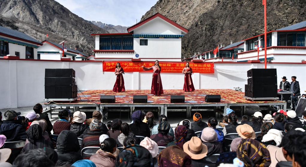 山南市隆子縣藝術(shù)團來到隆子縣斗玉珞巴民族鄉(xiāng)繞讓搬遷安置點開展藏歷新年文藝演出(2月15日攝)。新華社記者晉美多吉 攝