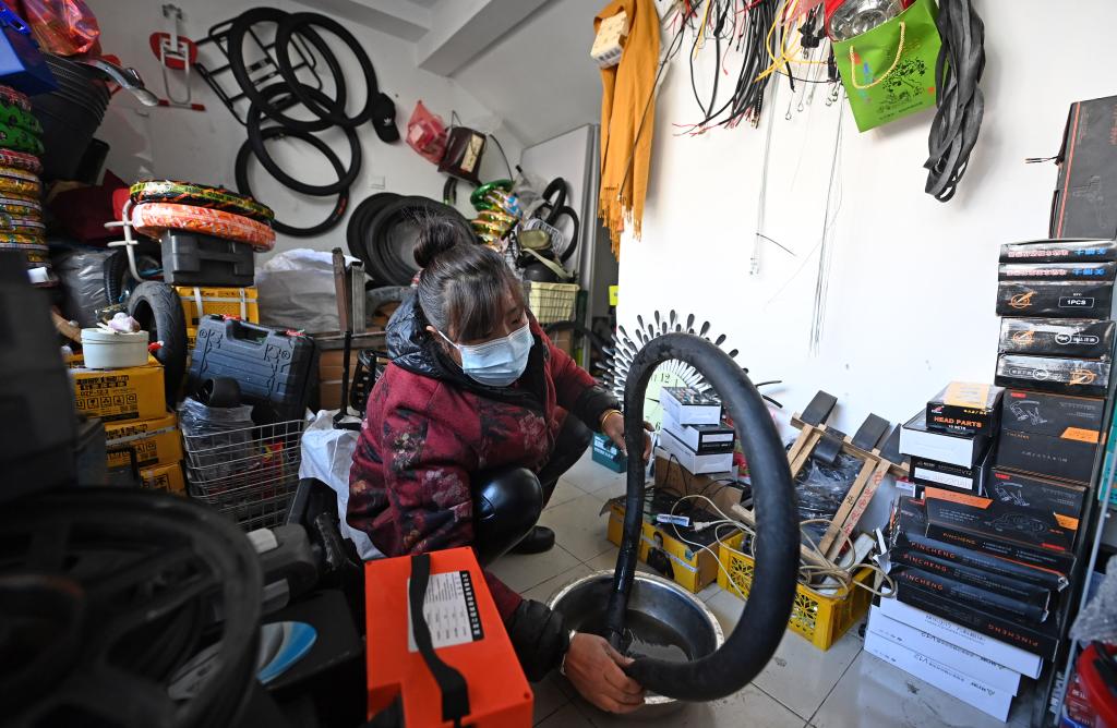 2023年2月24日,在中新天津生態城第三社區中心,一家自行車修理店經營者正在為顧客檢查輪胎。新華社記者趙子碩 攝