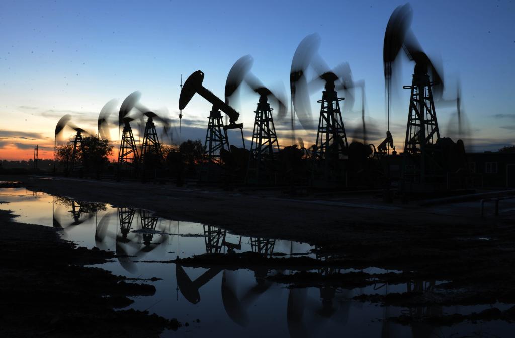 大慶油田采油機在夜色中工作。(新華社記者王建威攝)