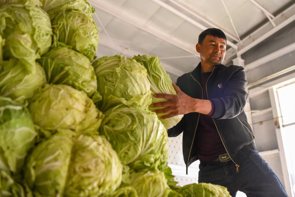 在阿克陶縣國投公司分揀中心,員工將大白菜卸車(3月27日攝)。新華社記者丁磊 攝