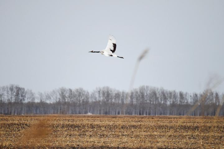 4月24日,在黑龍江省大慶市林甸縣鶴鳴湖鎮建國村,野生白枕鶴在田間飛翔。新華社記者石楓 攝