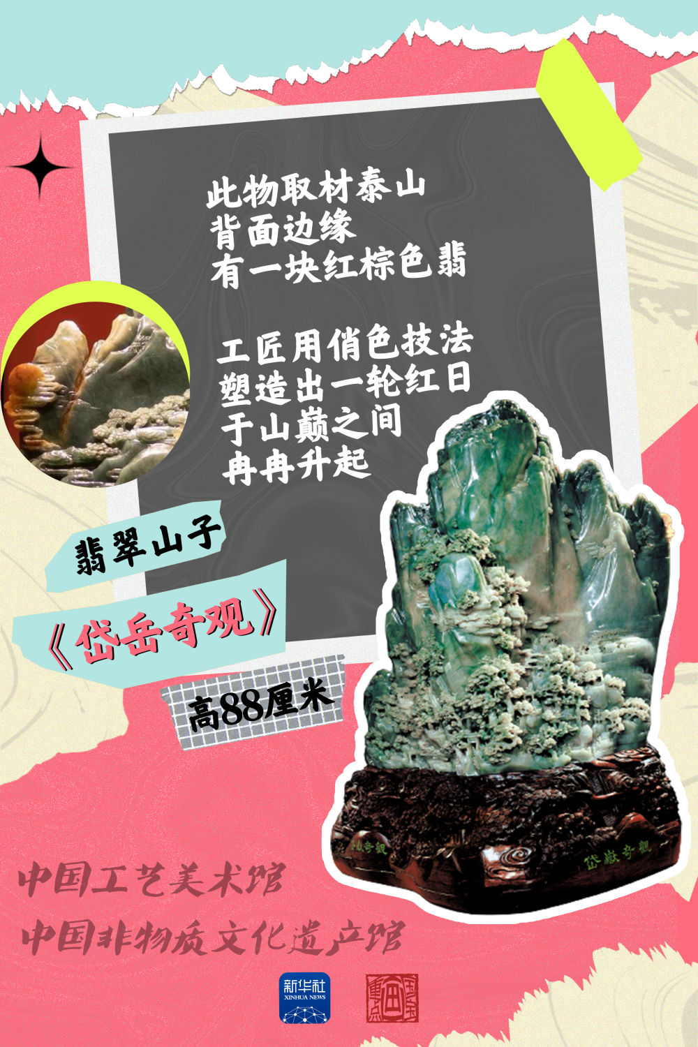 中國(guó)工藝美術(shù)館(中國(guó)非物質(zhì)文化遺產(chǎn)館)館藏的翡翠山子《岱岳奇觀》讓人嘆為觀止,它采用鏤雕、圓雕、深淺浮雕等工藝手法,體現(xiàn)層層疊疊的樹木、小橋。中景、遠(yuǎn)景采用淺浮雕、陰刻等手法,使之深遠(yuǎn)。作品背面用鐵線篆體字刻唐代詩(shī)人杜甫的《望岳》,填以金色,風(fēng)格古樸高雅,書法和工藝造型相映生輝。