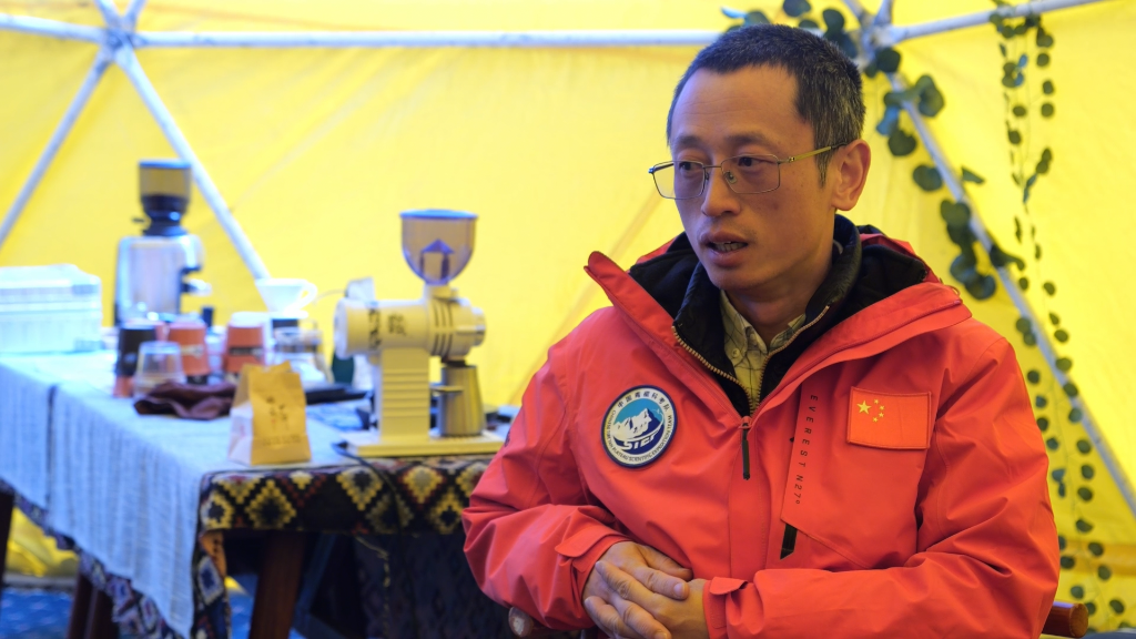 中國科學院西雙版納熱帶植物園的研究員蘇濤在珠峰登山大本營接受新華社記者采訪。