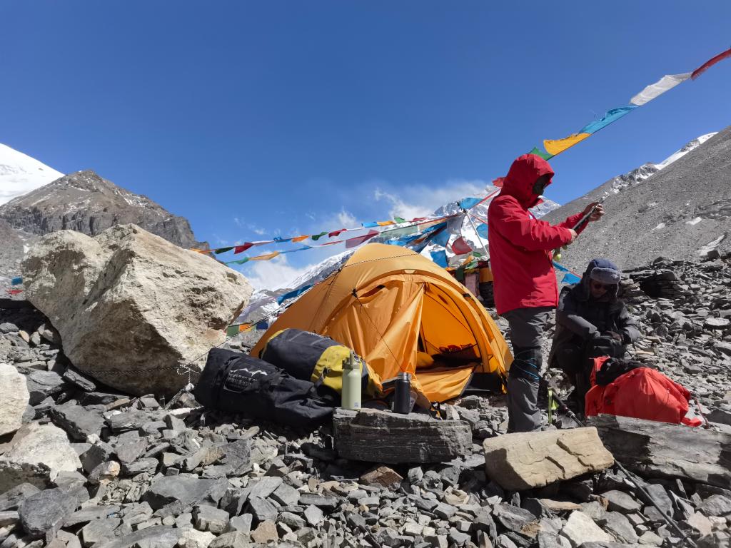 古生物科考分隊在珠峰開展野外科學考察活動,研究員蘇濤(左一)與隊員在山中尋找避風處露營。采訪對象供圖。
