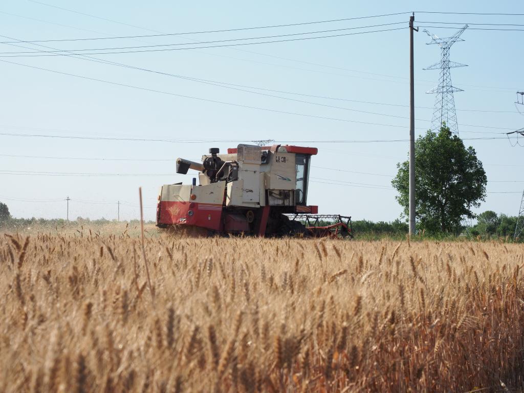 在山東省濱州市無(wú)棣縣水灣鎮(zhèn)王化如村,收割機(jī)正在麥地進(jìn)行作業(yè)。新華社記者 高天 攝