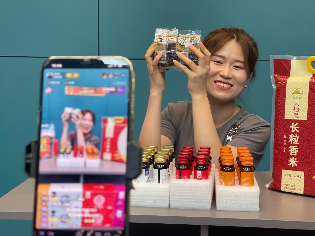 寧羴源公司直播間內,工作人員正在推介商品。新華社記者 蘇醒 攝