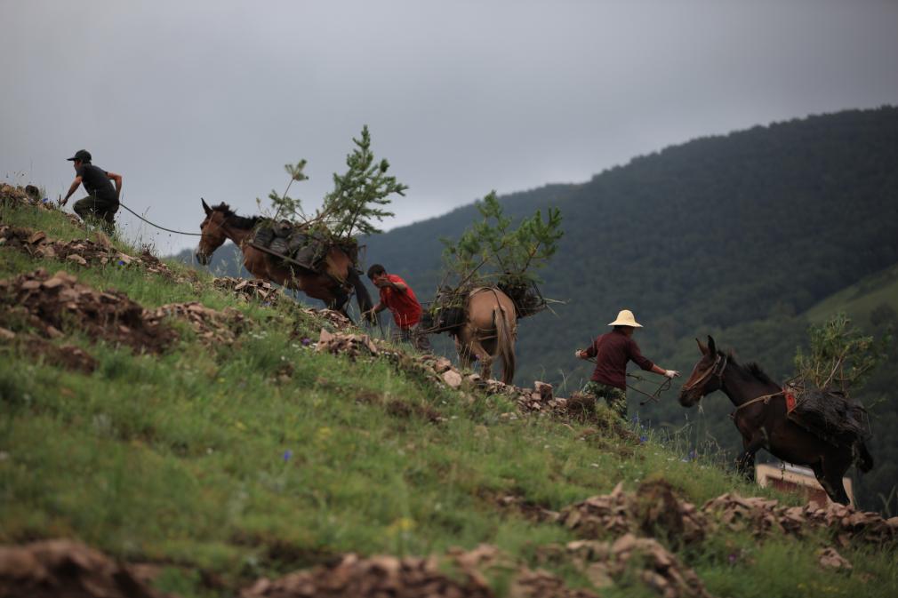 在承德豐寧滿族自治縣千松壩林場,群眾將樹苗運往山上。王立群 攝