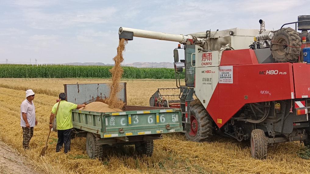 烏拉特中旗烏加河鎮(zhèn)農(nóng)戶正在收獲小麥。新華社記者 李云平 攝