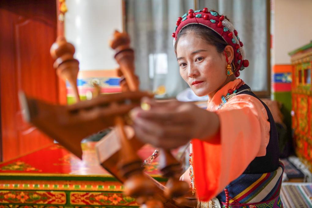 堆諧排練前,格桑卓瑪在家中為扎木念調音(8月4日攝)。新華社記者 邵澤東 攝