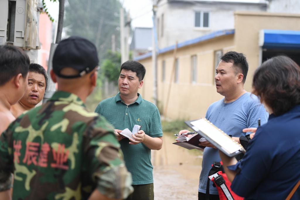 8月3日,新華社記者高博(右三)和同事在涿州市碼頭鎮(zhèn)北高莊村內(nèi)采訪受災(zāi)群眾。新華社記者 牟宇 攝