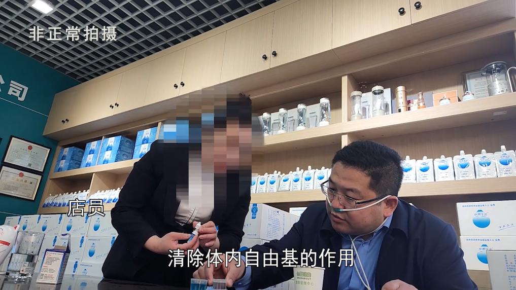 但是,他們卻上演著“移花接木、借嘴說話”的把戲,墻上大屏播放著講課視頻,一位學者模樣的人正在講述“氫氣四大生物學作用”、“氫醫學的發展史”等內容,并循環播放所謂“日本科學家”、“美國研究機構”、“中科院院士”等研究成果,誤導老人們將店里的制氫機與視頻內容相關聯,進而讓老人們產生“本店售賣的制氫機有治療作用”的錯覺。