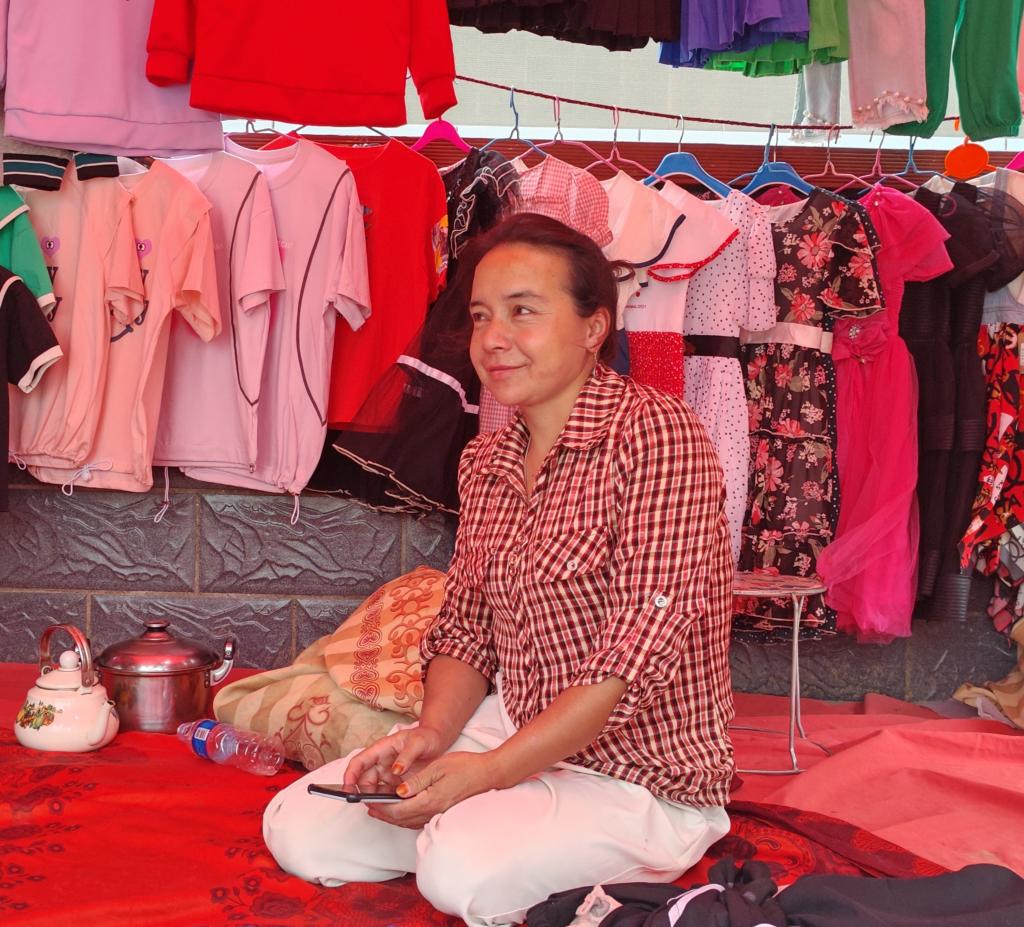 阿依米沙汗·買買提明在達里雅布依村擺攤賣衣服。(8月13日攝)新華社記者 茍立鋒 攝